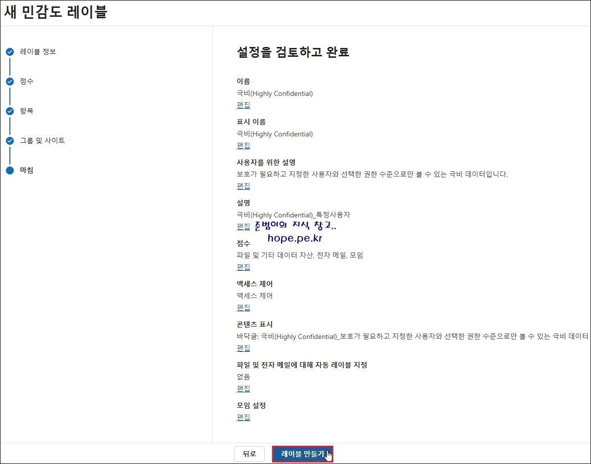새 민감도 레이블 > 마침 > 설정을 검토하고 완료 화면에서, '레이블 만들기' 를 클릭 합니다.
