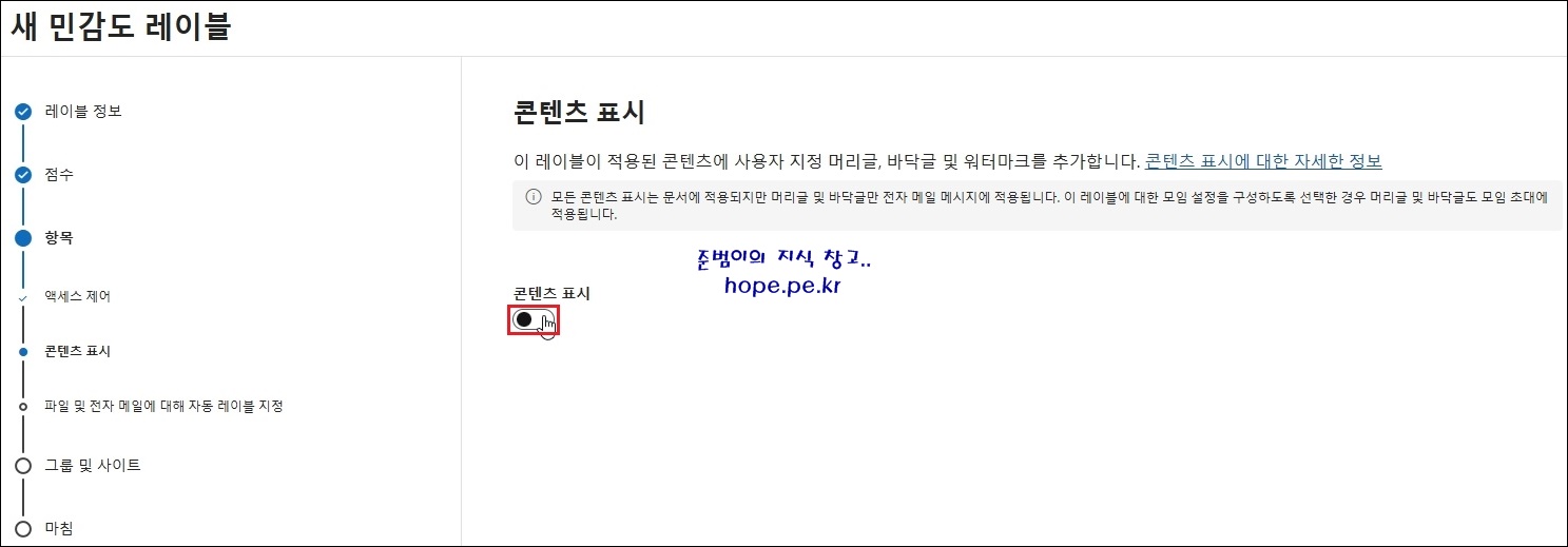 새 민감도 레이블 > 항목 > 콘텐츠 표시 화면에서, '콘텐츠 표시 버튼' 을 클릭 합니다.