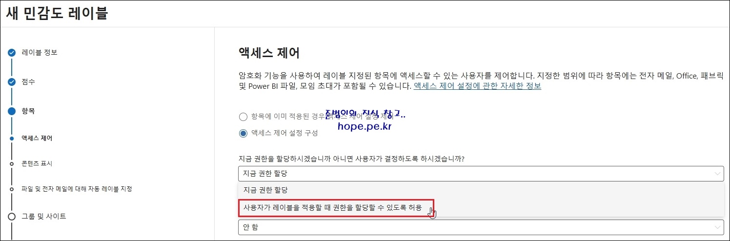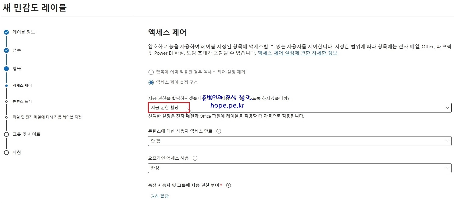 새 민감도 레이블 > 항목 > 액세스 제어 화면에서, '지금 권한을 할당하시겠습니까 아니면 사용자가 결정하도록 하시겠습니까?' 기능의 '지금 권한 할당' 을 클릭 합니다.