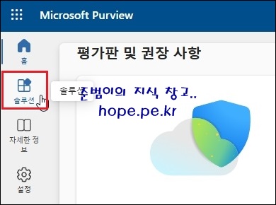 Microsoft Purview 포탈 접속 후, 좌측 메뉴에서 ' 솔루션' 을 클릭 합니다.