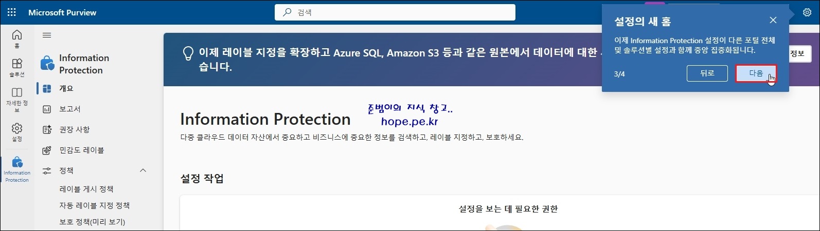 '설정의 새 홈 - 이제 Information Protection 설정이 다른 포털 전체 및 솔루션별 설정과 함께 중앙 집중화됩니다.'