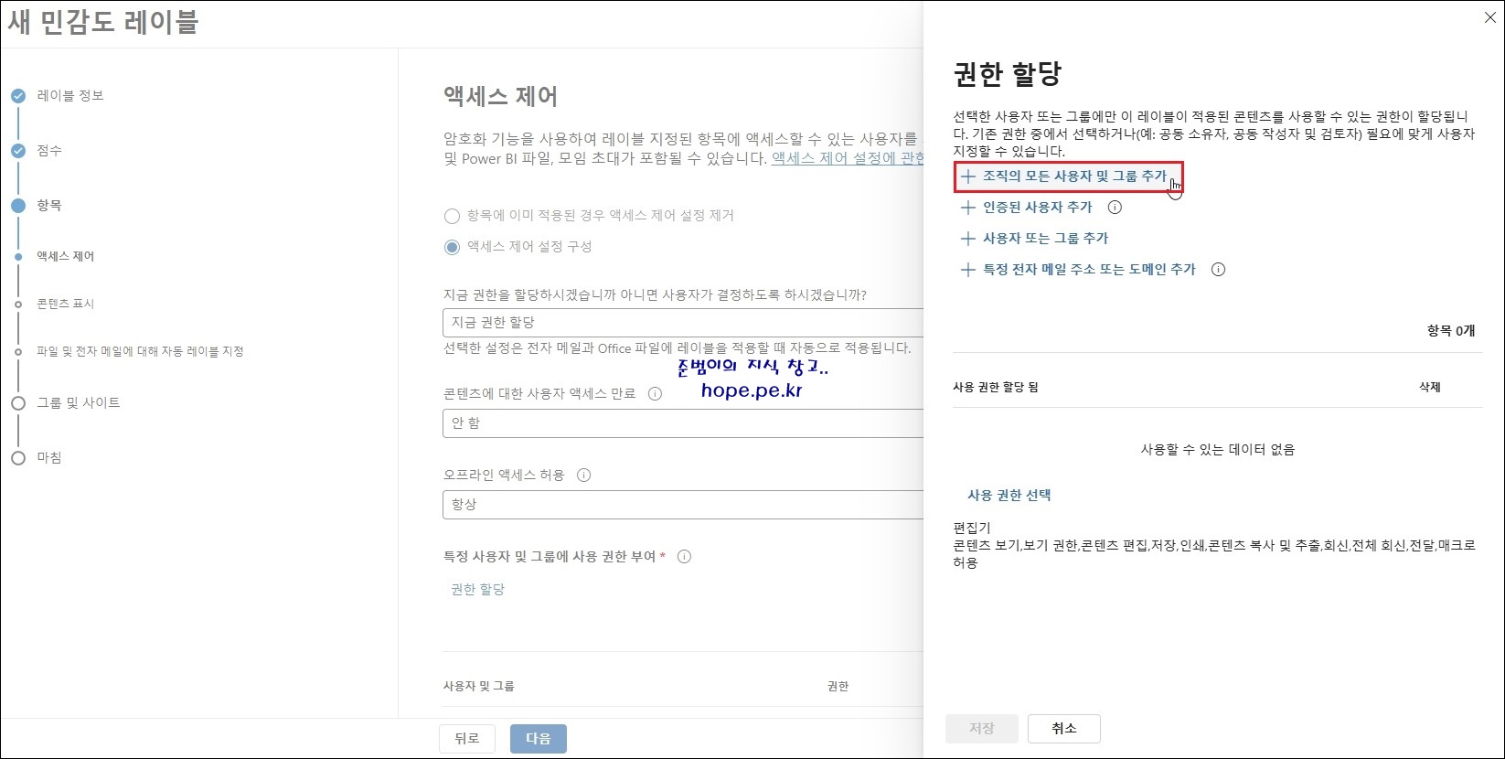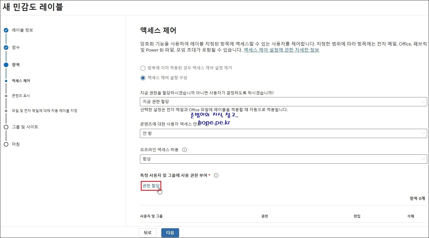 새 민감도 레이블 > 항목 > 액세스 제어 화면에서, '특정 사용자 및 그룹에 사용 권한 부여 > 권한 할당'' 을 클릭 합니다.