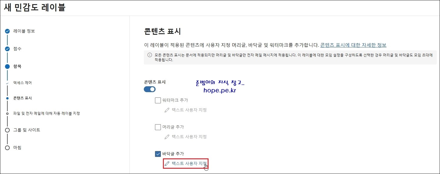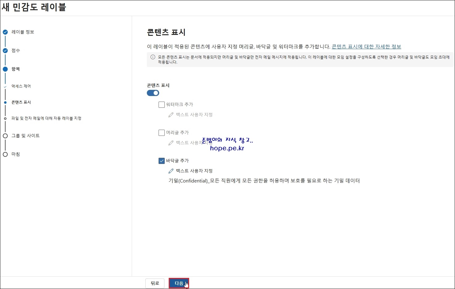 (본 포스팅에서는 바닥글 텍스트는 '기밀(Confidential)_모든 직원에게 모든 권한을 허용하며 보호를 필요로 하는 기밀 데이터' 로 입력 하였고, 나머지는 기본값을 사용 하였습니다.)