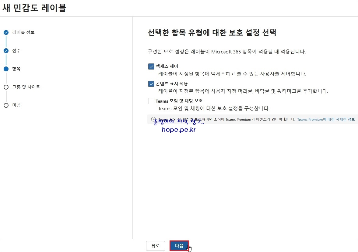 새 민감도 레이블 > 항목 > 선택한 항목 유형에 대한 보호 설정 선택 화면에서, 레이블 범위를 정의한 항목 유형에 대한 보호 설정을 선택 후 '다음' 을 클릭 합니다.