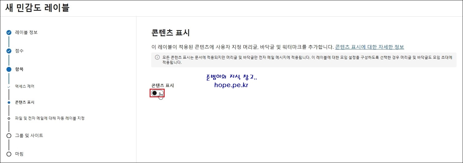 새 민감도 레이블 > 항목 > 콘텐츠 표시 화면에서, '콘텐츠 표시 버튼' 을 클릭 합니다.