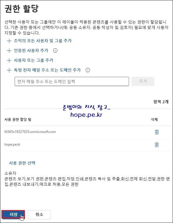 Cf) 조직 사용자에게 모든 권한을 부여하기 위해 소유자로 변경 합니다. 권한에 대한 설명은 차후 포스팅에서 자세하게 다뤄보도록 하겠습니다.