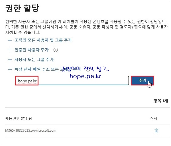 '조직 도메인' 입력 후 '추가' 를 클릭 합니다.