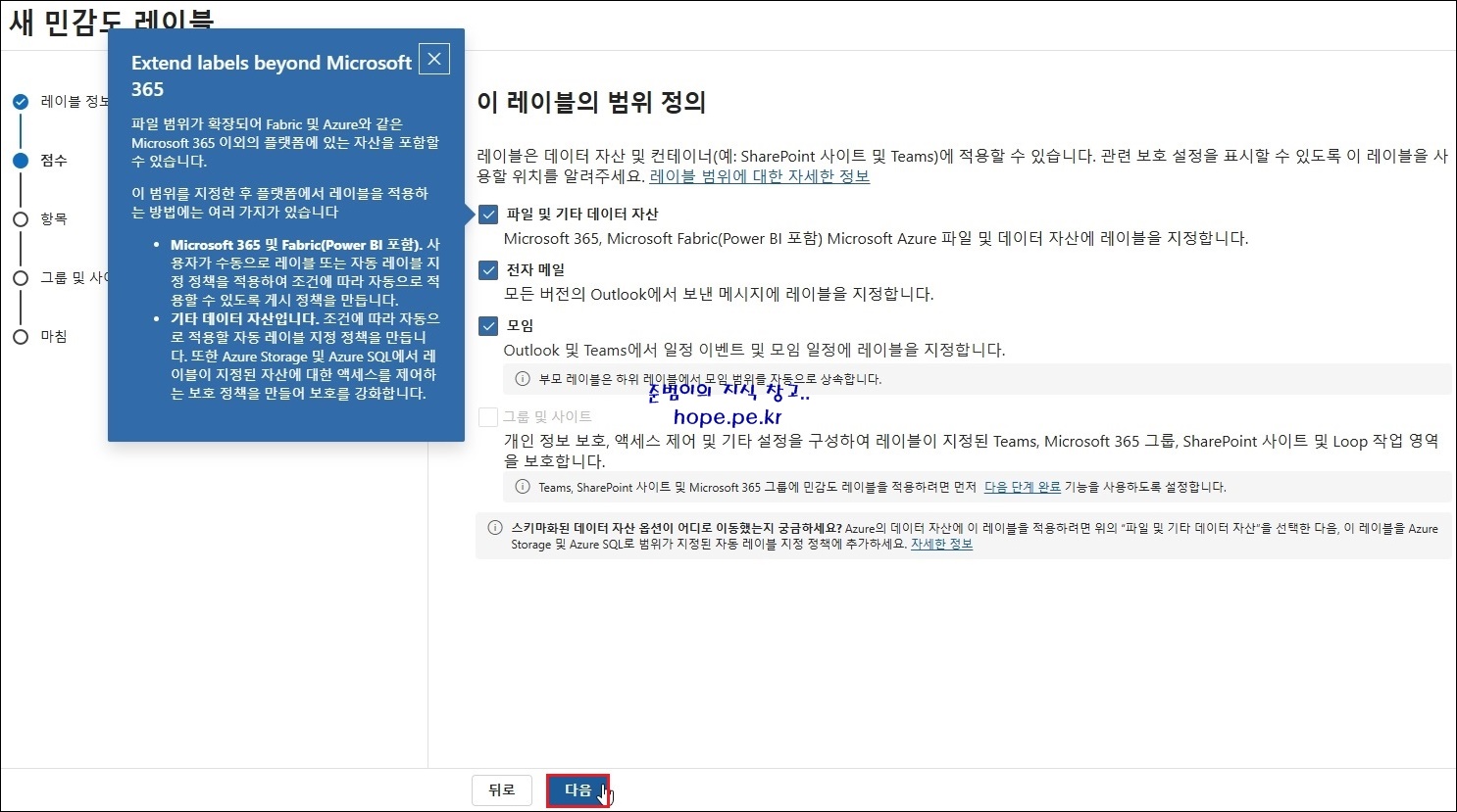 새 민감도 레이블 > 항목 > 파일 및 전자 메일에 대해 자동 레이블 지정 화면에서, '다음' 을 클릭 합니다.