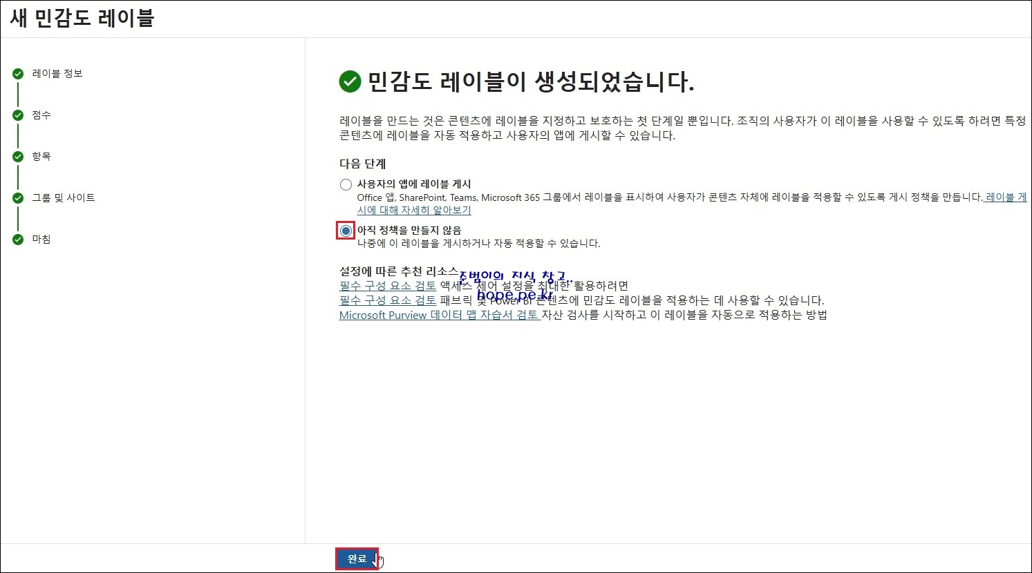 민감도 레이블이 생성되었습니다. 화면에서, '아직 정책을 만들지 않음' 을 클릭 후 '완료' 를 클릭 합니다.