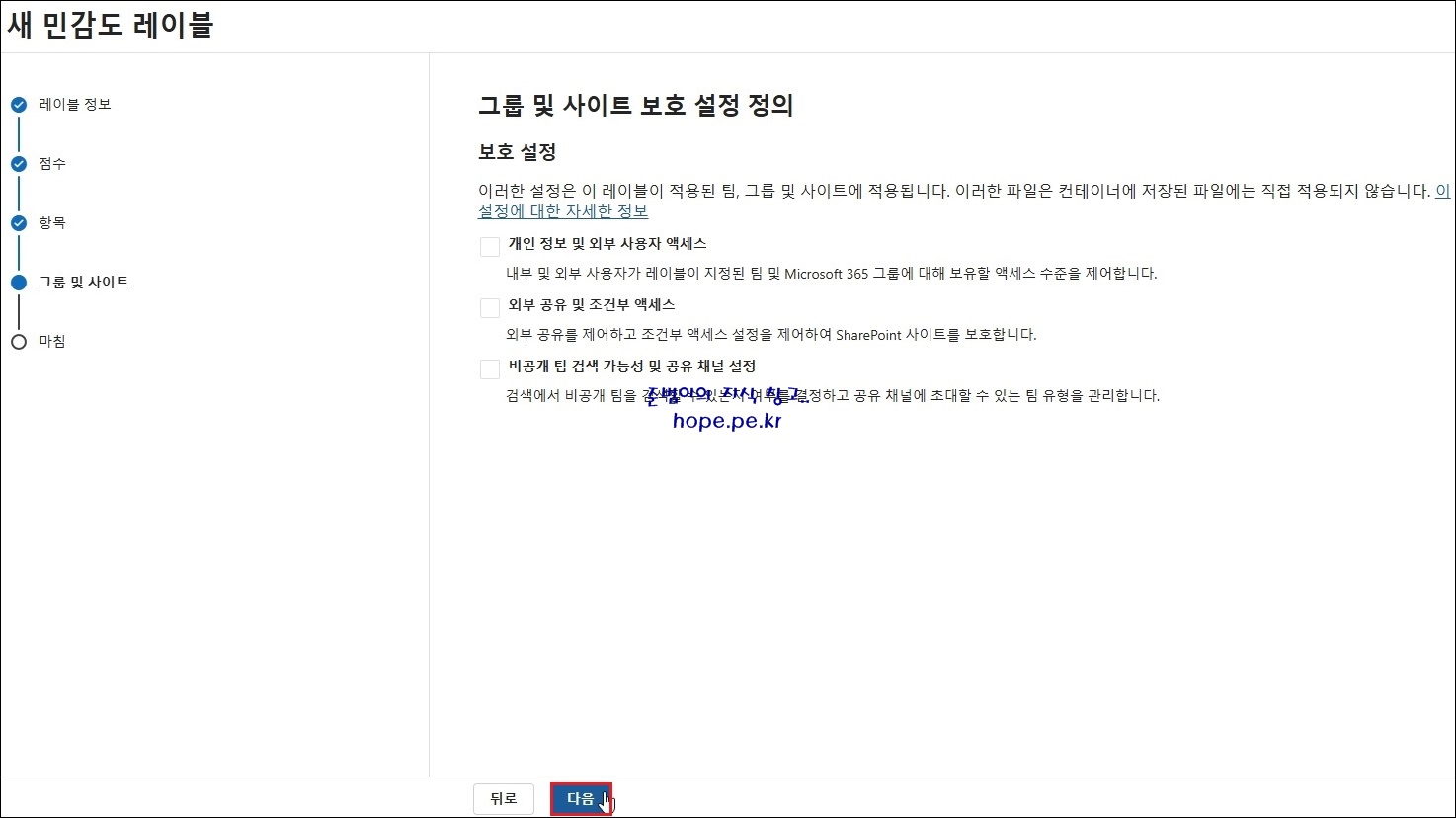 새 민감도 레이블 > 그룹 및 사이트 > 그룹 및 사이트 보호 설정 정의 화면에서, '다음' 을 클릭 합니다.