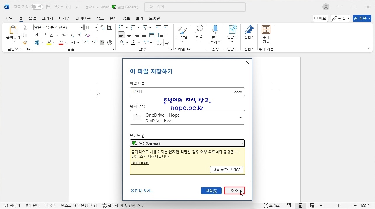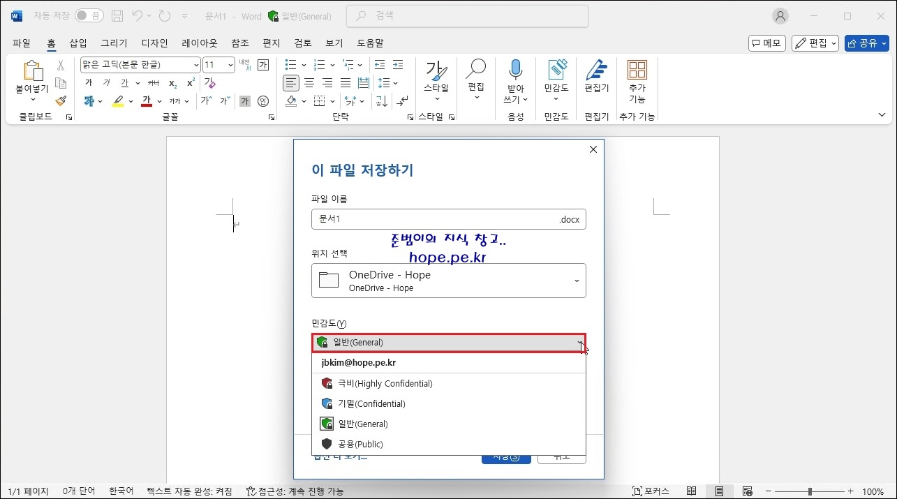 (해당 사용자에게 게시된 민감도 레이블 정책과 같이 3) 기본 레이블이 '일반(General)' 레이블로 적용 및 4) 문서 저장 시 '레이블 강제 적용' 이 적용 된 것 입니다.)