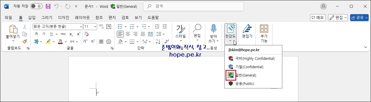 리본 메뉴에서 '민감도' 를 클릭 하면 해당 사용자에게 게시된 민감도 레이블 정책과 같이, 2) '극비(Highly Confidential), 기밀(Confidential), 일반(General), 공용(Public)' 민감도 레이블을 확인할 수 있습니다.