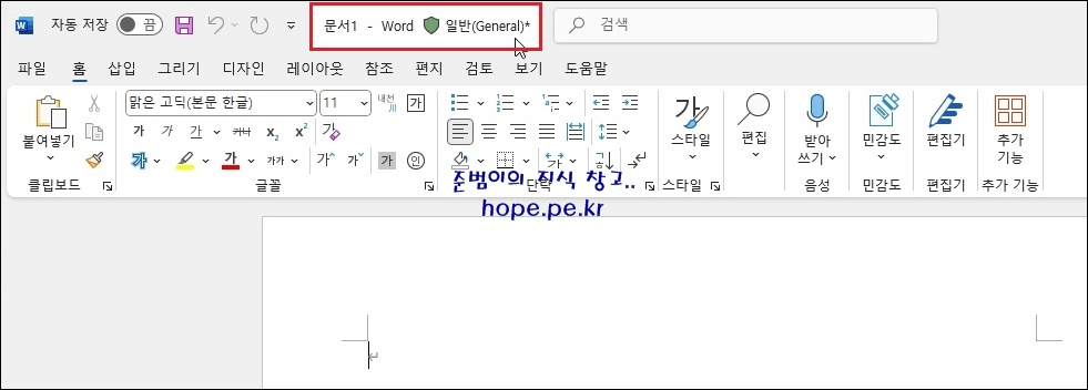 Word 프로그램이 실행되면 문서 상단에 '문서1 - Word (방패그림) 일반(General)*' 로 표시가 됩니다.