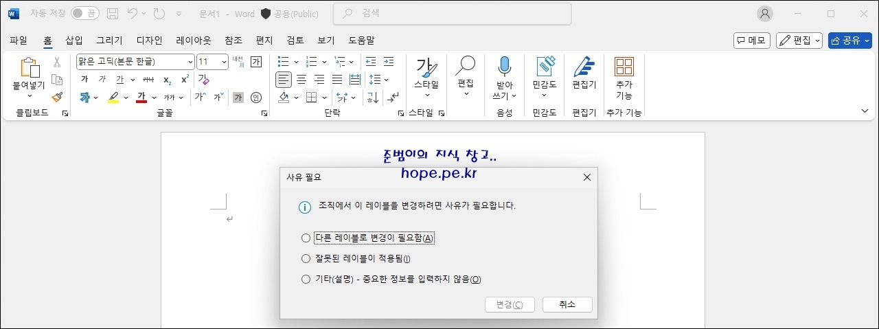그럼 다음과 같이 '사유 필요' 창이 발생 하면서, 조직에서 이 레이블을 변경하려면 사유가 필요합니다. 안내 창이 발생합니다. 레이블을 낮추기 위해서는 '다른 레이블로 변경이 필요함, 잘못된 레이블이 적용됨, 기타(설명) - 중요한 정보를 입력하지 않음' 중에 하나를 선택해야 합니다.