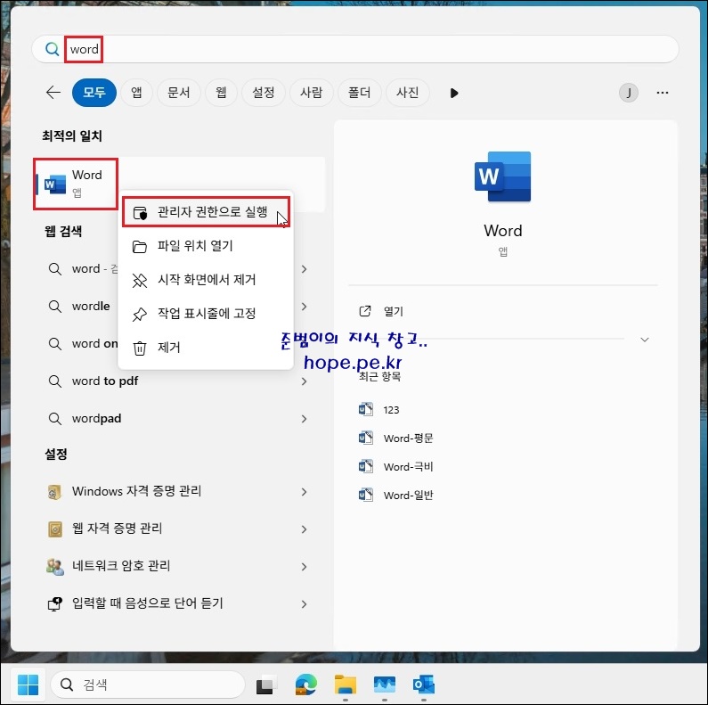 해당 그룹에 속한 사용자 PC에서 'Word 프로그램' 을 실행해보겠습니다.