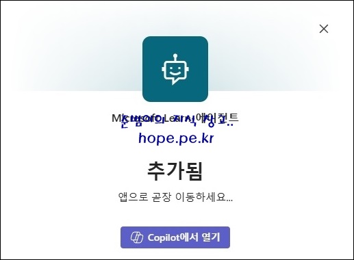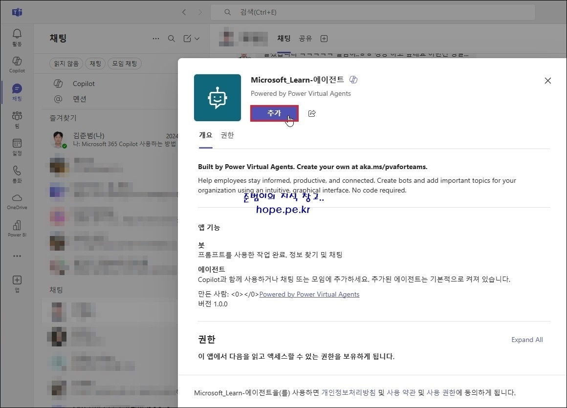 그러면 Teams가 실행되면서, 생성한 에이전트 창이 발생 합니다. '추가' 를 클릭 합니다.