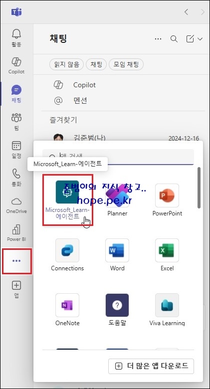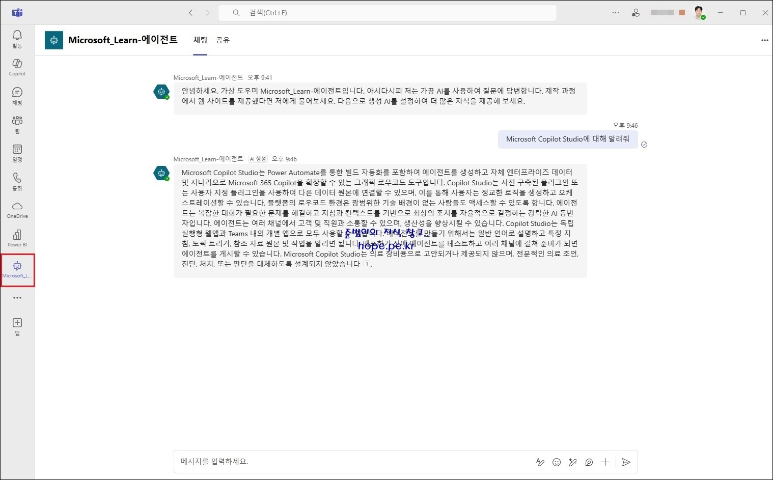 Teams의 좌측 메뉴에 해당 에이전트를 추가하여 사용도 가능 합니다.