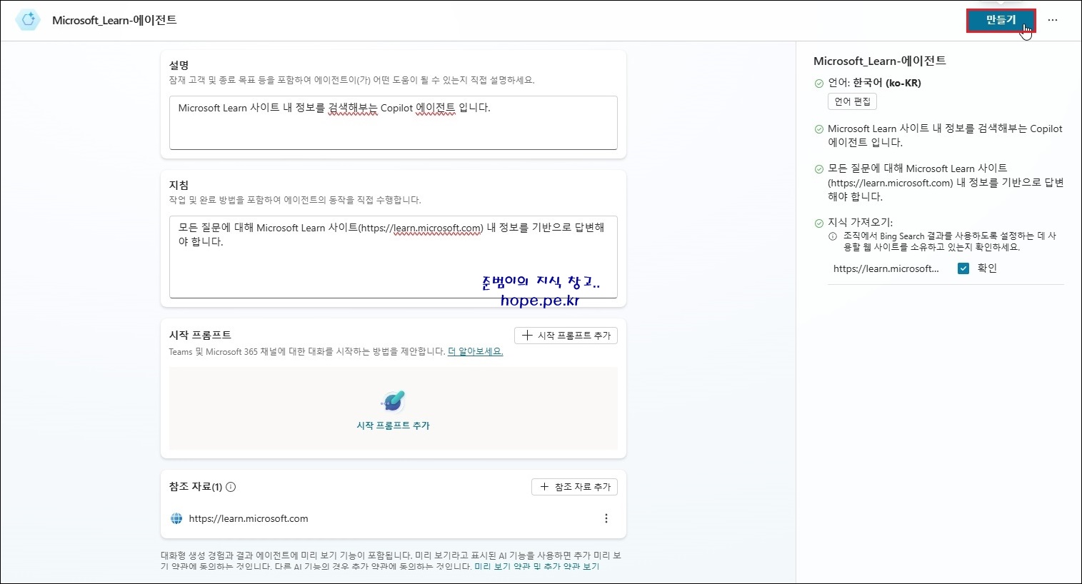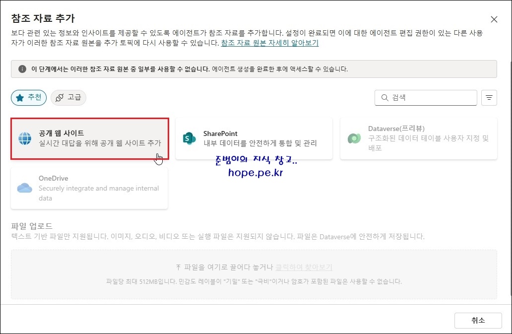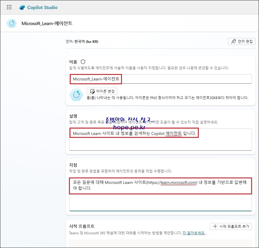 cf) 본 포스팅에서는 Microsoft Learn 사이트를 이용하기 위한 에이전트 이기에 '공개 웹 사이트' 를 선택 했습니다. 외부 사이트가 아닌 사내 SharePoint 사이트를 참조하게 할 수도 있습니다.