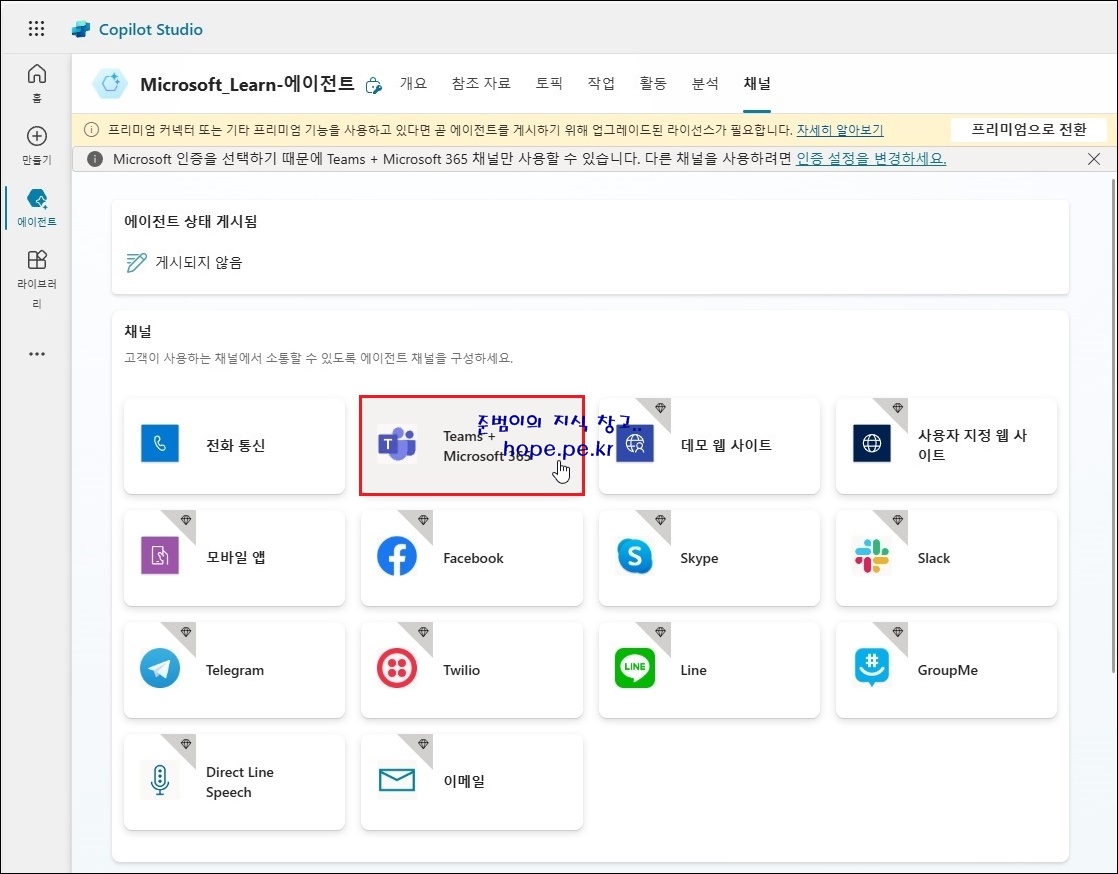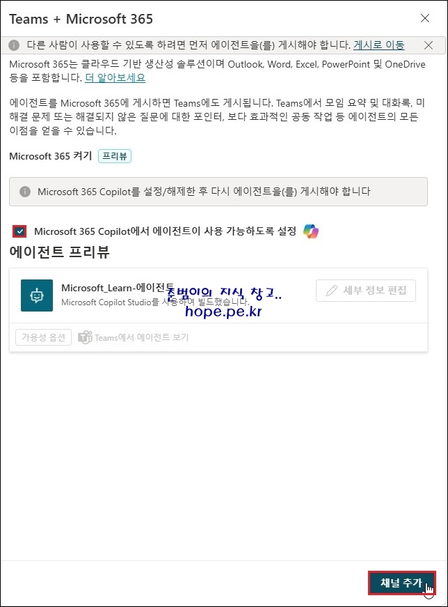 Teams + Microsoft 365 화면에서, 'Microsoft 365 Copilot에서 에이전트이 사용 가능하도록 설정' 에 체크 후 '채널 추가' 를 클릭 합니다.