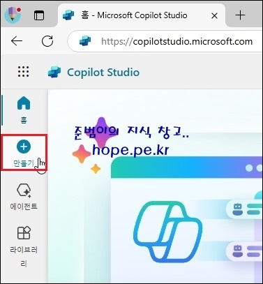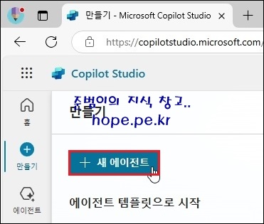 cf) 처음 접속을 하면 아래 스샷과 같이 'Copilot Studio를 시작합니다! Copilot Studio는 선택한 채널에 에이전트을(를) 만들고, 관리하고, 게시하는 데 필요한 완전한 종단간 환경을 제공합니다. 첫 번째 에이전트을(를) 만드는 템플릿으로 시작하세요.' 안내 창이 발생 합니다.