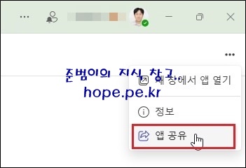 마지막으로 팁 하나 더! 우측 상단의 '· · · ' 버튼 클릭 후 '앱 공유' 를 클릭하면