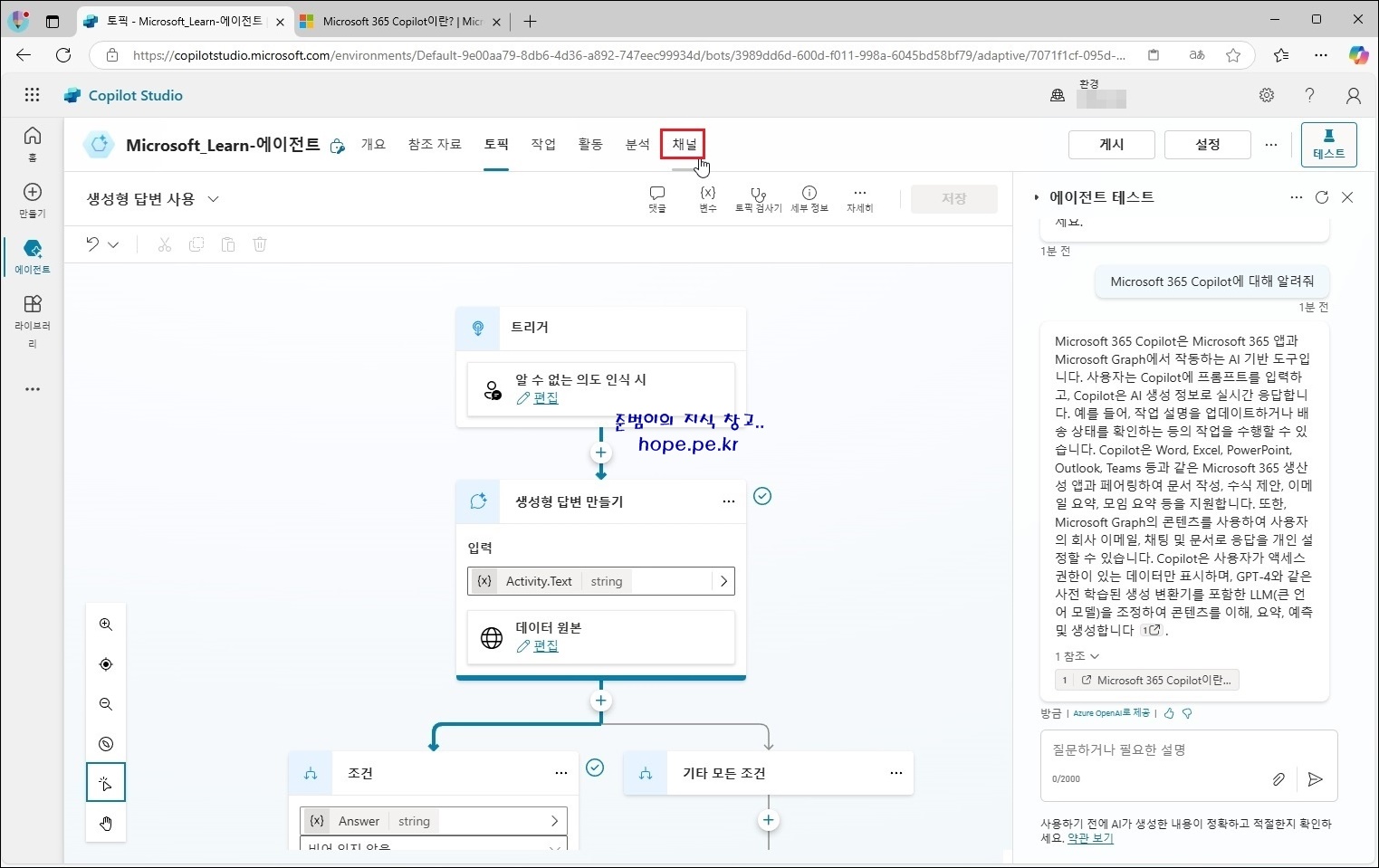 다시 에이전트 창으로 돌아와보면 토픽 탭이 표시되며 에이전트가 동작하는 흐름을 확인할 수 있습니다. '채널' 을 클릭 합니다.