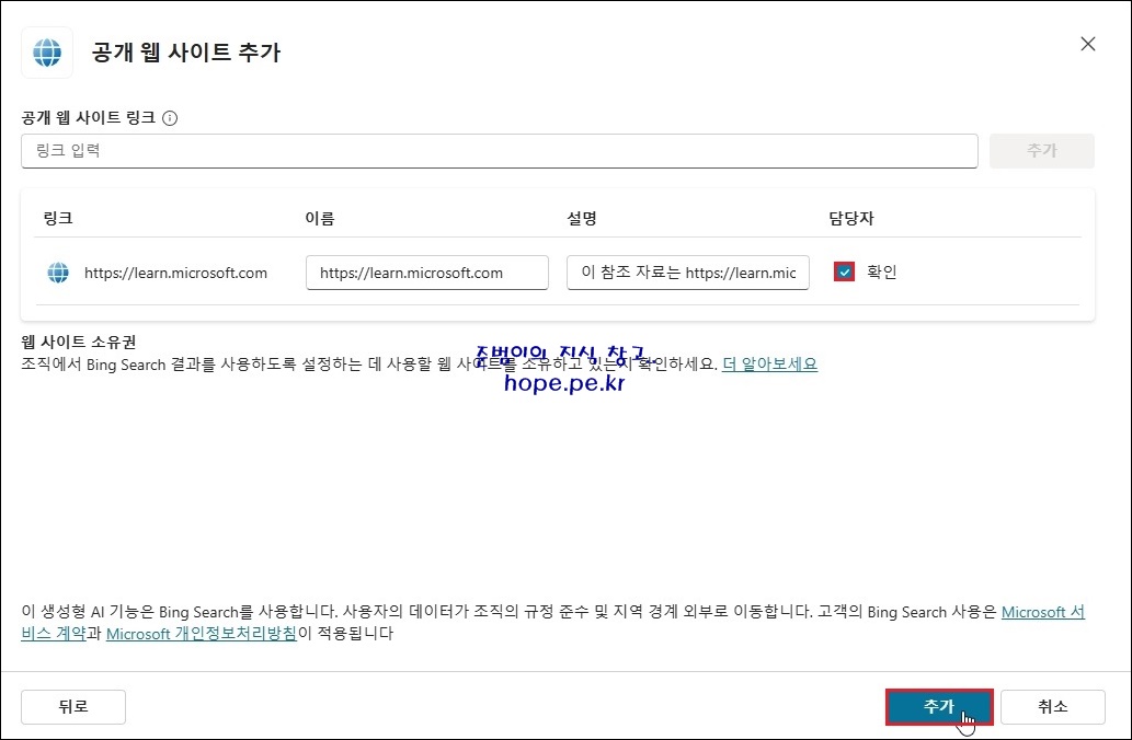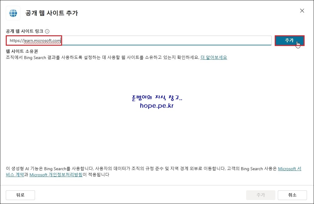 공개 웹 사이트 추가 화면에서, 'https://learn.microsoft.com' 을 입력 후 '추가' 를 클릭 합니다.