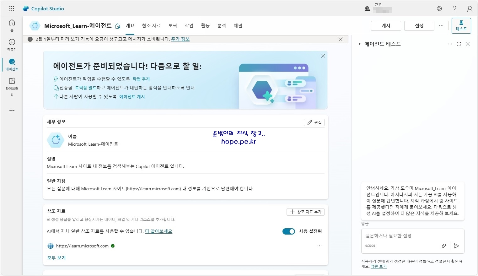 Copilot Studio를 사용하여 특정 웹 사이트 내용을 참조하여 질문에 응답을 하는 에이전트를 만들어 보겠습니다.