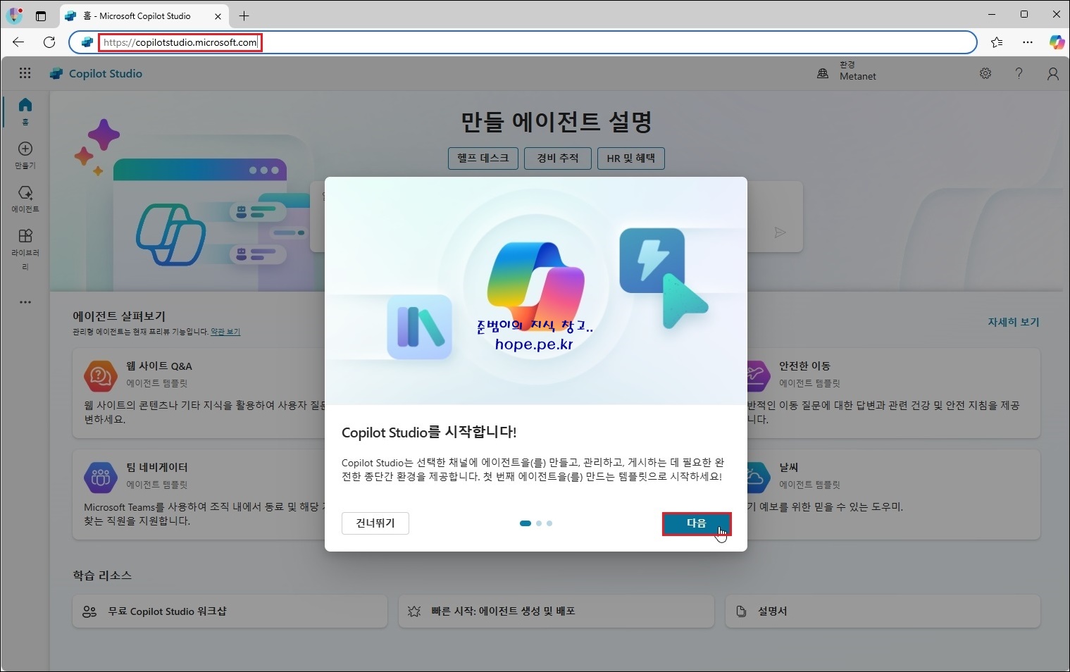 먼저 Copilot Studio 홈페이지(https://copilotstudio.microsoft.com)에 접속 합니다. 만약 안내 창이 발생하면, 안내 메세지 확인 후 '다음' 을 클릭 합니다.
