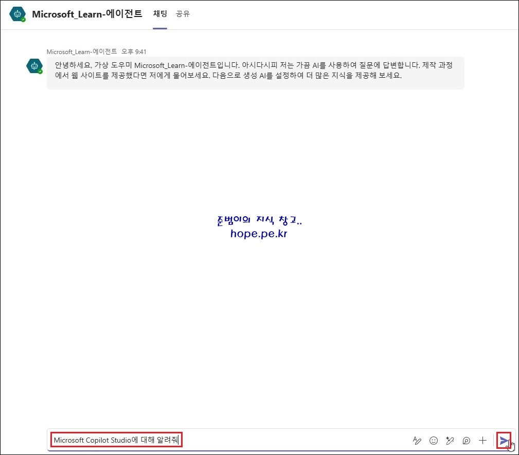 에이전트 테스트 창에서, 'Microsoft 365 Copilot에 대해 알려줘' 입력 후 화살표 버튼을 클릭 합니다.