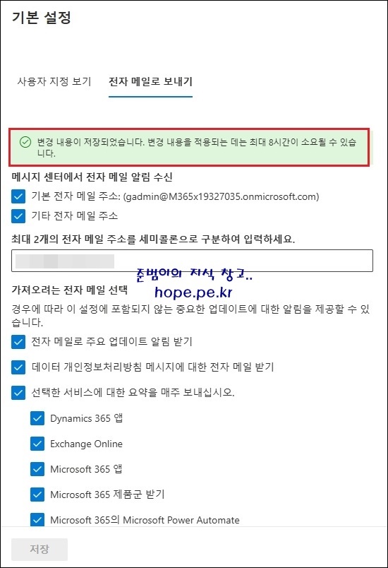 '변경 내용이 저장되었습니다. 변경 내용을 적용되는 데는 최대 8시간이 소요될 수 있습니다.' 메세지를 확인 합니다.